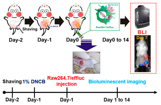 Molecular and genetic imaging modalities have been studied to visualize the localization, proliferation, and migration of immune, stem, and cancer cells [13,14,15,16]. Among various reporter-gene-based imaging approaches, in vivo bioluminescence imaging (BLI) using optical reporter genes including firefly, Gaussia, NanoLuc, and Renilla luciferases has been widely applied for in vivo cell tracking owing to its high sensitivity and ease of use [16,17,18]. Hence, to improve our understating of the complex biological effects of macrophages on AD-associated inflammation, we selected the highly sensitive enhanced firefly luciferase (effluc) optical imaging approach for in vivo macrophage tracking. This molecular imaging approach has been found to be suitable for the visualization of macrophage distribution in various acute and chronic inflammation models. For an animal disease model, dinitrochlorobenzene (DNCB)-induced AD was used in this study, because DNCB-induced AD exhibits drastic induction in IL-1β and TNF-α inflammatory cytokines at mRNA and protein levels, with T-cell activation and infiltration of neutrophil and monocytic cells. Moreover, DNCB-induced inflammation lesions are similar to the clinical symptoms of AD-like lesions, including erythema/hemorrhage, edema/excoriation, erosion, scarring/dryness, and lichenification. For the tracking of the macrophage infiltration to DNCB-induced AD lesions, immunocompetent mice with DNCB-induced AD received reporter macrophages via tail vein injection, and their migration into AD lesions was serially monitored using the optical imaging system, followed by ex vivo imaging of the excised AD lesions. Finally, using our macrophage imaging platform for the DNCB-induced AD model, we attempted to evaluate the therapeutic effects of dexamethasone (DEX), an anti-inflammatory agent, in mice with DNCB-induced AD (Figure 1).