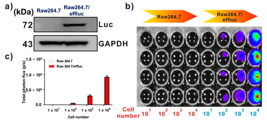 Effluc-gene-expressing reporter macrophages have been previously demonstrated [13]. Briefly, because the effluc gene is co-expressed with the Thy1.1 gene as a surrogate marker, we can easily analyze its expression levels using fluorescence-activated cell sorting (FACS) analysis with the anti-Thy1.1 antibody. The results of FACS demonstrated higher levels of effluc gene reporter macrophages. Immunoblotting with the anti-luciferase antibody showed the 72 kDa luciferase protein in Raw264.7/effluc cells, but not in parental cells (Figure 2a). In vitro BLI revealed an increase in bioluminescence signals in a cell-number-dependent manner in Raw264.7/effluc cells, but not in parental cells (Figure 2b,c).