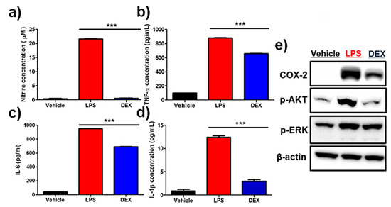 Effects of dexamethasone (DEX) on lipopolysaccharide (LPS)-stimulated reporter macrophages. Reporter macrophages were pre-treated with the indicated concentration of DEX for 1 h and then with LPS (1 μg/mL, 24 h). (a) Nitric oxide (NO) levels in respective reporter macrophages. Expression levels of the cytokines (b) TNF-α, (c) IL-6, and (d) IL-1β in the culture medium were determined by the enzyme-linked immunosorbent assay (ELISA). (e) Western blot analysis showing the expression levels of COX-2, p-AKT, and p-ERK in respective reporter macrophages. Values obtained from three individual experiment are expressed as the mean ± standard deviation (SD), *** p < 0.001