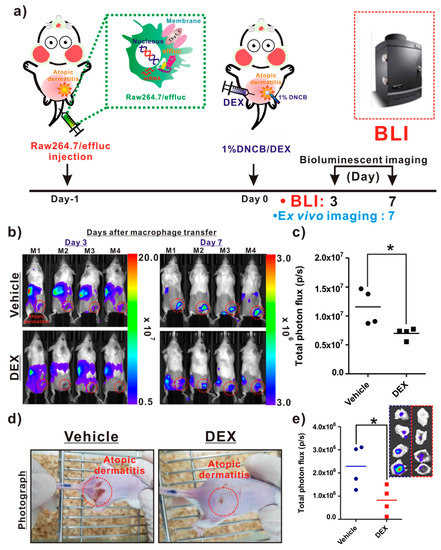 In vivo assessment of the therapeutic effects of an atopic dermatitis (AD)-modulating agent using the macrophage tracking approach. (a) Protocols for in vivo animal experiments. (b) In vivo optical imaging of the macrophage migration into AD-like lesions in the vehicle- and dexamethasone (DEX)-treated mice. The dotted red circles indicate the AD-like lesions. (c) Quantification of the bioluminescence imaging (BLI) signals (vehicle and DEX) in AD-like lesions. (d) Photograph of AD mice. (e) Quantification of the BLI signals in excised AD-like lesions from each group. Values obtained from three individual experiment are expressed as the mean ± standard deviation (SD), * p < 0.05