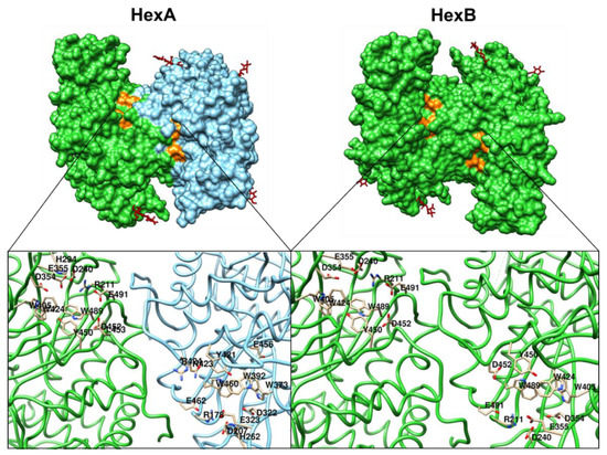 Structure of HexA and HexB. HexA (PDB 2gjx) isolated from human placenta, while HexB (PDB 1o7a) was recombinantly expressed in insect cells. α- and β-subunits are colored in light blue and green, respectively. N-glycans and active sites are colored in red and orange, respectively. The residues present in the active site of each subunit are also shown.