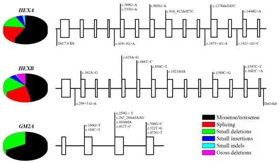 According to The Human Gene Mutation Database, currently 181, 103, and 9 mutations have been reported for HEXA, HEXB, and GM2A genes, respectively, including missense/nonsense, splicing, small deletion and indels, and gross deletions (Figure 3) [46,47,48]. Although the type and frequency of mutations have been linked to the demographic origin of the patients, for HEXA the most representative mutation is the transition c.533 G > A that changes arginine by histidine (p.R178H) and affects the catalytic site of the α subunit, altering its function and stability [46,47,48,49]. In the case of HEXB; a frequent mutation is c.445 + 1 G > A, which occurs in a conserved intronic site that promotes a complete loss of a canonical splice donor site [46,47]. Finally, mutations in GM2A are extremely rare and only 9 mutations have been described on 11 patients [48,49]. Figure 3 show some of the most common mutations on HEXA, HEXB, and GM2A genes.