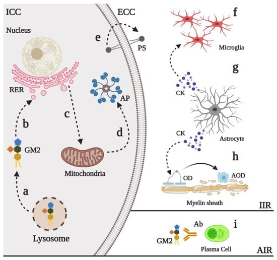 Physiopathological events in GM2 gangliosidoses. Innate (IIR) and adaptative (AIR) immune response have been described in GM2 gangliosidoses. Upon the impaired of lysosomal degradation of the GM2 ganglioside, this can be released into the cytoplasm (a) where its sialic acid can interact with the rough endoplasmic reticulum (RER) (b). Sustained stress into RER induces the activation of proapoptotic proteins such as CHOP (c) that promotes mitochondrial-mediated apoptosis (d) In early apoptosis states, the phosphatidylserine (PS) is externalized (e), which promotes the recruitment of several proinflammatory cells such as microglia (f). Astrogliosis has also been reported in the GM2 gangliosidoses (g). The release of several astrocyte-derived cytokines (CK), such as CCL2 and CXCL10, increases the recruitment of microglia and the apoptosis in myelinating oligodendrocytes (AOD), which induces neuron demyelination (h). Finally, auto antibodies (Ab) against GM2 ganglioside seem to contribute to the physiopathology of the GM2 gangliosidoses (i), although the precise mechanism of its release has not described. ECC: Extracellular compartment, ICC: Intracellular compartment, AP: Apoptosome, OD: Oligodendrocyte.