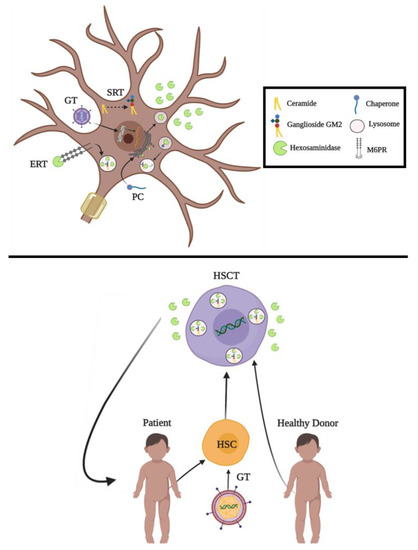 Since Hex can be exported to the extracellular space [37,45] and cross-correct neighboring cells through a M6PR-mediated mechanism [4,106], the administration of hematopoietic stem cells (HSC), could provide sufficient amounts of the deficient enzyme in a natural o engineered-dependent manner [106,107]. Allogenic HSC transplantation (HSCT) can be performed from bone marrow (BM), umbilical cordon (UC), or peripheral blood after a myeloablative regimen [108]. This strategy has been successfully performed in other LSDs such as MPS I [109,110], MPS II [111], and Gaucher type 1 and 2 [112].