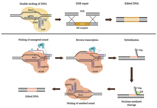 Approaches for genome editing using CRISPR/Cas9. The upper panel shows the classical strategy of knock-in using a ribonucleoprotein complex (sgRNA-guide Cas9) to guide to Cas9 to the target DNA and cut the double-strand (DSB). After the DSB, repair machinery is activated. In the presence of a donor sequence (HR template), homologous recombination is favored. To promote the recombination event of a gene of interest (GOI), the HR template must be flanked by homologous recombination arms which are complementary to the 5′ and 3′-ends of the sequence into the gene that will be subject of edition. Typically, between 100-150bp and 400-800bp are suitable for small (<50 bp) and large (>100) insertions, respectively [165,166]. In the lower panel, Prime Editing (PE) is represented. PE uses a nickase Cas9 (nCas9-H840A) fused to reverse transcriptase (RT) and a guide RNA (pegRNA) which is engineered with a sequence in the 5′-end.20 nucleotides guide to nCas9 to the target DNA and a sequence in the 3-end with a primer-binding site (A) as well as an RT template (B) that could be between 7 to 12 nucleotides [167]. Upon reverse transcription, newly synthesized strand hybridizes to the unedited strand (US) forming a mismatch and a 5′-flap strand which is removed by exonucleases (EN) such as EXO1 [168]. The mismatch is resolved with the introduction of a new nCas9 coupled to a simple sgRNA which guide to nCas9 to the edited strand (ES), about 50 bp from the pegRNA-mediated nick, to cut the US and use the sequence of the ES as a template for repair de simple cut [167]. In both cases upper and lower panels, newly edited DNA is successfully obtained with different efficiencies.