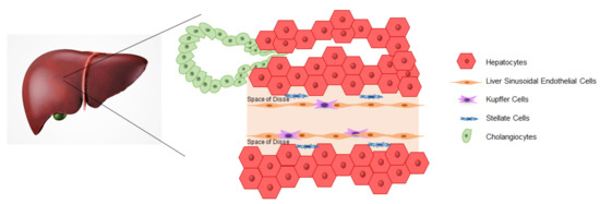 The liver is the largest organ of the human body that is responsible for several functions related to the maintenance of homeostasis. The liver works as an endocrine and exocrine gland covering essential body functions, such as bile production, plasma protein secretion, hormone synthesis, and drug metabolization. Liver functions are maintained by parenchymal cells, cholangiocytes, and hepatocytes, in direct contact with the blood through hepatic sinusoids, which are lined by liver sinusoidal endothelial cells (LSECs). Non-parenchymal cells are represented by LSECs and Kupffer cells (KCs), which are resident liver macrophages and stellate cells (Figure 1) [1].