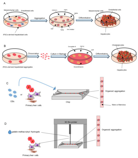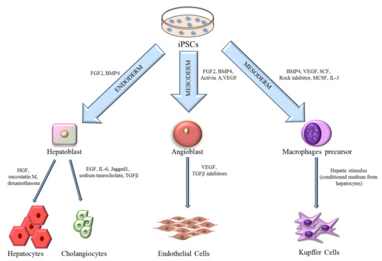 Other approaches have been explored to treat liver failure, such as the xenotransplant, bio-artificial liver, and hepatocyte transplantation, due to the low availability of organs and a lifetime treatment of patients with immunosuppressive drugs [4]. Hepatocytes are commonly used because an appropriate number of cells can be isolated from livers that are not suitable for a liver transplantation. However, these treatments do not represent a definitive cure, but are commonly utilized as a temporary solution [5]. The major issue regarding hepatocytes is represented by a low survival and engraftment rate due to a lack of cellular communication between hepatocytes and the non-parenchymal cells. In fact, liver function is maintained by highly orchestrated interactions within the hepatic cellular network [6]. In consideration of these issues, further investigations are essential to ameliorate hepatocyte engraftment, including an optimal cell combination of adult hepatic cells (hepatocytes, LSECs, cholangiocytes, KCs, and stellate cells) to restore liver functionality. Hepatocytes, LSECs, and KCs are characterized by a low proliferation potential in vitro and it is difficult to maintain their phenotype. When considering these characteristics, induced pluripotent stem cells (iPSCs) represent an optimal alternative cell source. The iPSCs can be obtained through the ectopic expression of at least four transcription factors that are relevant for the maintenance of embryonic stem cell (ESCs) identity (f.i. Oct4, Sox-2, Klf4, and c-Myc), inducing pluripotency by reprogramming mature somatic cells [7,8,9]. The obtained iPSCs show an ESC-like phenotype with the potential of differentiating into several cell types, in addition to an unlimited self-renewal capacity. These cells are considered to be the leading candidate for a donor cell source in regenerative medicine [10]. As a result, several methods and transcription factor cocktails have been tested to generate bona fide and clinical grade iPSCs. However, despite this potential, two-dimensional (2D) cell cultures of iPSCs or primary cells are not enough to study cell-cell communications, tissue microenvironments, or replicate organ structures that mimic the in vivo environment. As a result, three-dimensional (3D) cultures were developed with the aim of replicating high cell-extracellular matrix (ECM) and cell–cell interactions [11,12]. They are referred to as organoids, which defines 3D aggregates that contain several cell types capable of self-organization. Organoids can be generated from iPSCs, ESCs or specific adult cells, making them a promising model for basic and translational research. Several attempts have been made to generate liver organoids by different methods, which results in vascularized organoids, cholangiocytes based organoids, and, in recent years, next generation liver models developed on a chip. All of these methods share the use of iPSC derived hepatocytes that are the best characterized from the perspective of differentiation. In this review, we will describe iPSC applications as a tool for differentiating into various liver cell types, including hepatocytes, cholangiocytes, endothelial cells, and KCs. Further, we will explore the advantages in generating self-assemble or matrix-guided 3D organoids to build functional bio-artificial livers that can be useful for disease modeling, drug screening, and regenerative medicine approaches for liver diseases.