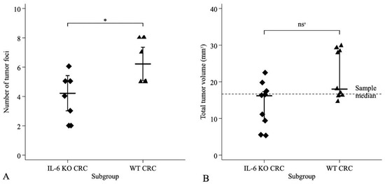Distribution of (A) tumor foci and (B) total tumor volume (TTV) in IL-6 KO CRC model and WT CRC model groups. Total number in both groups was n = 9. A—number of tumor foci with two-sided Student–test; B—TTV with nonparametric tests. * Two-Sided Student’s t-test: t16 = −2.79, p = 0.013. nsa (a not significant) Kolmogorov-Smirnov test exact p = 0.352, Mann-Whitney test p = 0.058, non-parametric equality of medians test exact p = 0.347.