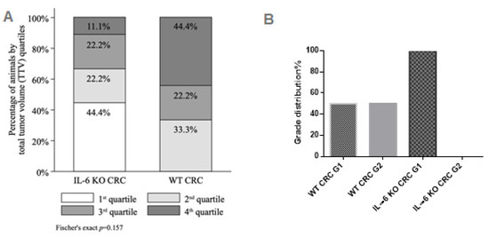 (A) Total tumor volume (TTV) quartiles by IL-6 status (IL-6 KO CRC n = 9, WT CRC n = 9) with Fisher’s exact test; (B) tumor grade distribution.