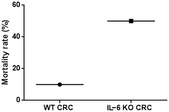 Mortality rate in WT CRC and IL-6 KO CRC groups (WT, IL-6 KO n = 9, respectively). Mortality rate was calculated as the number of dead animals at Week 12 divided by the total number of animals at Day 1.