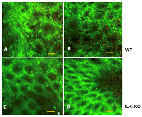 Colonic mucosal surface was imaged in vivo, using intraluminal fluorescence confocal endomicroscopy. Eventual differences in colonic mucosal crypts in WT and IL-6 KO mice were imaged with a nuclear counterstaining and mucus autofluorescence. One WT mouse and two KO mice were anesthetized using 3% v/v isoflurane gas (Isofluran-KP®, Medicus Partner, Ltd., Budaörs, Hungary) and maintained on a heated bed. Then, after 1 mL of saline enema application, a 6% m/v acriflavine solution in water for injection (Sigma-Aldrich Ltd., Budapest, Hungary) in 0.5 mL volume was rectally applied to each mouse. Acriflavine, a green fluorescent DNA-binding molecule is a general cell-staining intravital dye to obtain fluorescent contrast of luminal mucosal cells. Thereafter, the S1500 fiberoptic microscope probe tip (resolution 3.3 microns, field-of-view diameter, 600 microns) of the Cellvizio Lab Dual Band imaging system (Mauna Kea Technologies, Inc., Paris, France) was intrarectally applied into the descending colon of the mice and dual band (480 nm green and 660 nm red) live microscopic images of the mucosal walls were collected. After terminal euthanasia of the same animals with Euthasol ad us. vet solution (Medicus Partner, Budaörs, Hungary) colons were opened, and mucosal surfaces were investigated ex vivo also within the same animals. Cells in crypts fluoresce in green, with an especially prominently stained nucleus. Mucus in the crypts can be present as red fluorescent dots (from autofluorescence).