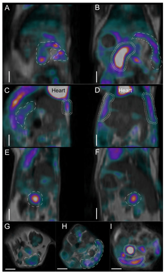 Inflammatory reactions and water signal enhancements in the WT animal were also more prominent in MRI and PET imaging, showing an enlarged retroperitoneal lymph node in MRI and its moderate–high FDG uptake (Figure S4). The simultaneous placement of mice in the multi-animal bed enabled to create an abdominal cross-sectional overview of the reconstructed PET/MRI images (Figure S5).
