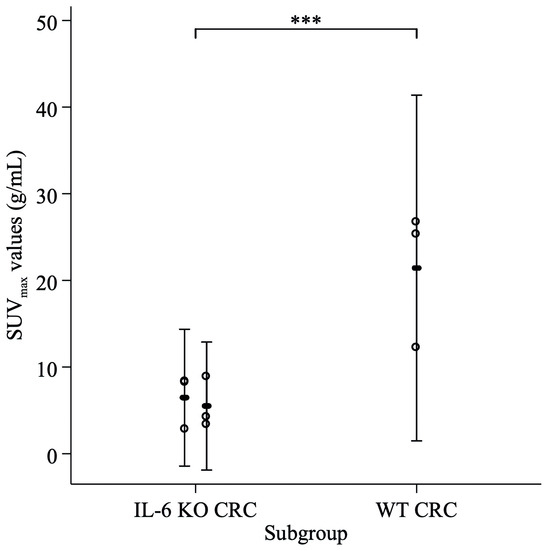 We compared the FDG uptake in the highly avid tumorous foci in the WT animal and the two IL-6 KO animals, by fitting a mixed effects model using a maximum-likelihood estimator, assuming fixed effect for IL-6 status and a random effect for maximal standardized uptake values (SUVmax) by each animal. FDG uptake was significantly greater in the WT animal compared to the IL-6 KO animals (p < 0.001) (Figure 8).