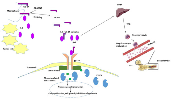 Hypothetical role of IL-6 in oncogenesis and tumor-associated thrombocytosis. IL-6 is produced in the tumor microenvironment both by mononuclear and tumor cells. Elevated levels of IL-6 induce thrombopoietin production in the liver, which in turn activates the maturation of megakaryocytes and the production of platelets resulting elevated platelet count. Simultaneously, IL-6 binds to the soluble form of IL-6 receptor (sIL-6R) and activates the gp130/JAK/STAT3 pathway leading to the translocation of phosphorylated STAT3 homodimer to the nucleus in the tumor cells and to the transcription of different genes inducing proliferation, cell growth and the inhibition of apoptosis. mIL-6R—membrane-bound IL-6 receptor, TPO—thrombopoietin, ADAM17—a disintegrin and metalloproteinase 17; STAT3—signal transducer and activator transcription 3.