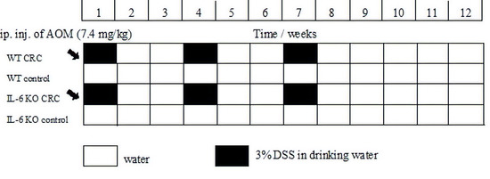 Timeline description of colorectal cancer induction using the AOM/DSS inflammation-related model. AOM—azoxymethane; DSS—dextran sodium sulfate; water—drinking water. Black arrow: administration of AOM intraperitoneally.