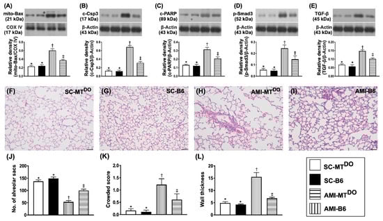 2.3. The Protein Expressions of Apoptosis and Fibrosis, and the Lung Injury Score in LV Myocardium by 60 Days after AMI Induction