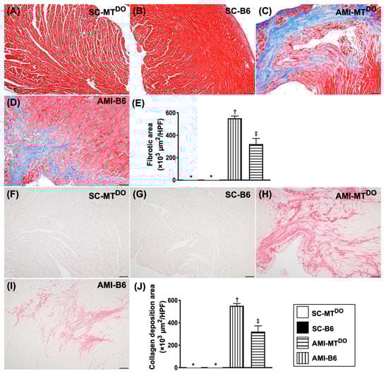 2.6. The Fibrosis and Collagen Deposition area, Infarct Area and Cellular Level of DNA Damage Biomarkers in LV Myocardium by 60 Days after AMI Induction