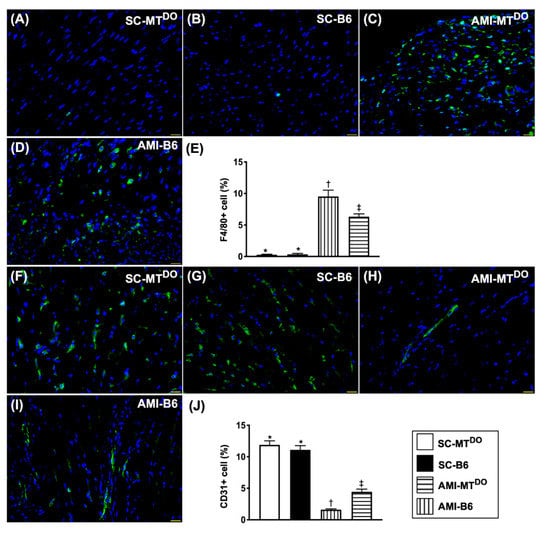 2.7. Inflammatory Cell Infiltration and Endothelial Cell Distribution in LV Myocardium by 60 Days after AMI Induction
