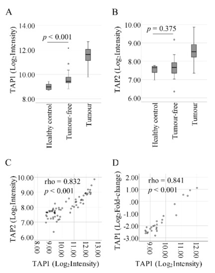 Microarray data were confirmed using reverse transcription quantitative PCR (RT-qPCR) of tongue tissue from 10 of the healthy controls and 8 of the paired tumor/tumor-free samples from patients with SCCOT, using the QuantStudio 6 Flex real-time PCR system (Thermo Fisher Scientific, Waltham, MA, USA). Custom primers used were TAP1 (forward: CTGGACTCCCTCAGGGCTAT, reverse: GGTTTCCGGATCAATGCTCG). As reference genes, RPL13A (forward: CACGAGGTTGGCTGGAAGTA, reverse: ACGTTCTTCTCGGCCTGTTT) and GAPDH (forward: GCCCTCAACGACCACTTTGT, reverse: TTACTCCTTGGAGGCCATGTG) were used. All primers were obtained from Thermo Fisher Scientific. Gene expression was quantified using the relative standard curve method. Spearman correlation coefficient (rho) was calculated to evaluate correlation strength between microarray and RT-qPCR results.