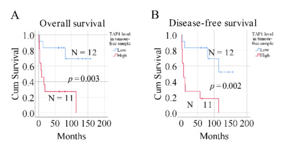 The influence of TAP1 levels in tumor-free samples on patient survival. Kaplan–Meier curves of overall (A) and disease-free (B) survival. Blue lines represent patients with low TAP1 levels, and red lines patients with high TAP1 levels. Log-rank test for overall (p = 0.003) and disease-free survival (p = 0.002). N = number of samples.