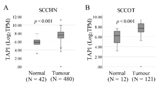 TCGA-HNSC (The Cancer Genome Atlas-head and neck squamous cell carcinoma) cohort data. Plots show TAP1 levels in tumors and tumor-free samples, the latter denominated “normal” in TCGA, for (A) the whole group of squamous cell carcinoma of the head and neck–SCCHN (p < 0.001) and (B) for squamous cell carcinoma of the tongue (SCCOT) only (p < 0.001).