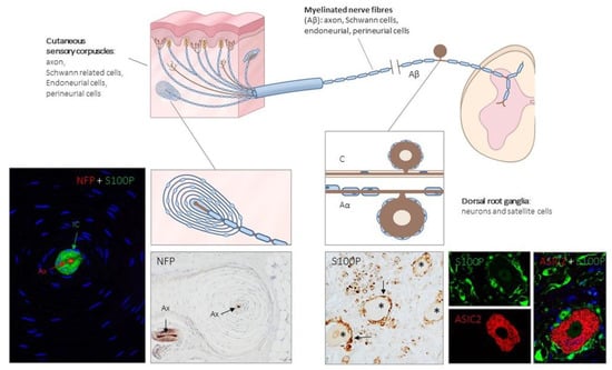 Schematic representation of the afferent innervation of mammalian glabrous skin. Glabrous skin is supplied by myelinated and non-myelinated nerve fibers (Aβ, Aδ, C), originated from large, intermediate and small sized neurons (low-threshold mechanoreceptors (LTMRs) and nociceptors) localized in the dorsal root ganglia (DRG). Aβ nerve fibers end in the dermis forming different morphotypes of sensory corpuscles. Photos on the left side correspond to sections of Pacini’s corpuscles immunostained for neurofilament proteins (NFP) and S100 protein (S100P) to, respectively, label the axon (Ax; red immunofluorescence) and the Schwann-related cells (IC: inner core; green fluorescence). Right side photos correspond to a section of human lumbar DRG—immunostained for S100P and acid-sensing ion channel protein 2 (ASIC2). S100 protein labels satellite cells (arrows and green fluorescence) while neuronal cell bodies (asterisks and red fluorescence) display ASIC2 positivity.