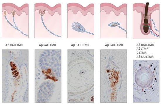 LTMR sensory neurons are pseudo-unipolar, and the axonal processes that extend to the skin are associated with specialized cells: Merkel cells (forming Merkel cell–neurite complexes), Schwann-like cells that form part of the sensory corpuscles (Meissner corpuscles, Ruffini’s corpuscles, Pacinian corpuscles), or cells of hair follicles (sensory nerve endings associated to hair follicles) [3,4,5,6]. Aβ fibers originate in intermediate- or large-sized mechanosensory neurons and are the main fiber type mediating discriminative touch [4,7,8], although Aδ fibers [9] and C fibers [10] from small-sized neurons are also involved in mechanosensation.