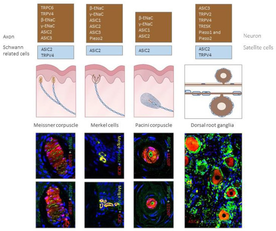 Data in humans are scarce. Using immunohistochemistry, ASIC1 was detected in the central axon of Pacinian corpuscles whereas ASIC2 was present in the inner core, and ASIC3 was undetectable [116]. In a detailed study carried out in human digital skin and lumbar DRG, ASIC2 was found in the axons of Merkel cell–neurite complexes, Meissner and Pacinian corpuscles; moreover, a variable percentage of Meissner (8%) and Pacinian corpuscles (27%) also displayed ASIC2 Immunoreactivity in the lamellar and inner core Schwann-related cells. Almost all intermediate or large sized neurons in DRG (mean diameter ≥ 20–70 µm) were ASIC2 positive, and thus compatible with a mechanosensory neuron phenotype [117].