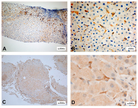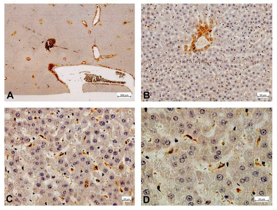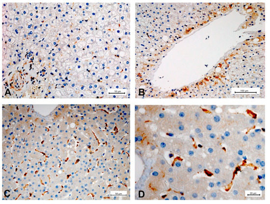 To illustrate the expression of PDE-5 in healthy and diseased rat and human liver tissue, tissue samples from an animal study and clinical studies were immunostained (Figure 2, Figure 3, Figure 4 and Figure 5). The animal research protocol was approved by the local institutional animal care and use committee (Regierungspräsidium Freiburg, Germany, ref. No. G-13/89). Animal care was performed in accordance to the rules of the German animal protection law and the animal care guidelines of the European community (2010/63/EU). The analysis of human tissue samples was part of a study that has been approved by the local ethics committee (Albert-Ludwigs-University, Freiburg, Germany, HBUF 474/14 and 299/01). All patients had signed informed consent.