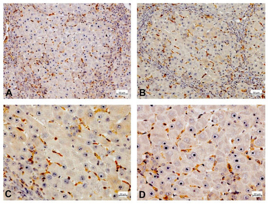 PDE-5 expression in cirrhotic rat liver tissue (thioacetamide (TAA)-model). Mesenchymal cells present in interconnecting fibrous septa (A,B) and sinusoidal lining cells of parenchymal islands (A–D) are immunolabeled by PDE-5 antibody. The architectural disturbance of liver parenchyma is associated with marked PDE-5 immunoreactivity of sinusoidal lining cells throughout the nodules (C,D).