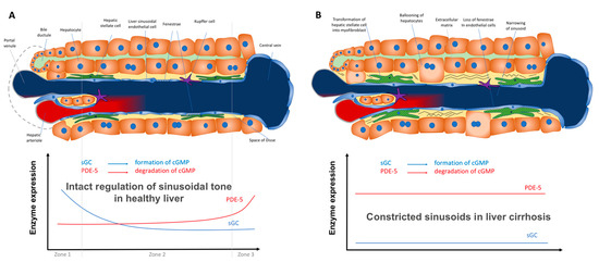 The paper of Hall et al. contains the most comprehensive data of alterations in the components of the NO-cGMP pathway in experimental liver cirrhosis [101]. However, a possible zonation of the respective enzymes and the potential role of PDE-5 were not taken into account. Regarding the sum of all currently available biochemical data for sGC and PDE-5, we suggest a model that shows the mechanism how PDE-5 inhibitors may lower portal pressure in cirrhotic portal hypertension (Figure 1B,C).