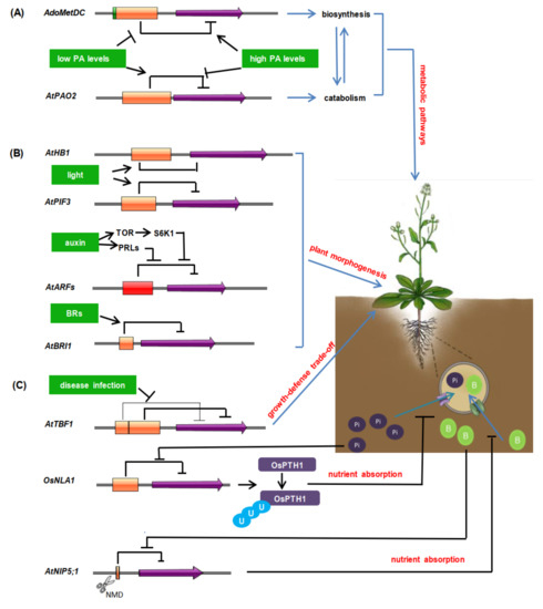 Overview of the regulatory functions of uORFs in plants. (A). uORF-mediated translational regulation of plant metabolic pathways [64,66,67]. (B). The regulatory roles of uORFs in plant morphogenesis [58,84,87,88]. (C). The regulatory roles of uORFs in disease resistance and nutrient absorption [43,89,92]. NMD means nonsense-mediated mRNA decay. The blue circles with “U”, the green circles with “B”, and the purple circles with “Pi” mean ubiquitination, boron, and phosphorus, respectively. Orange boxes represent uORFs, and the box length is proportional to uORF length. Green box in AdoMetDC represents tiny uORF, and red box in AtARFs means mutiple uORFs. Purple arrows represent mORFs. Black bars indicate negative regulation, black solid lines indicate positive regulation.