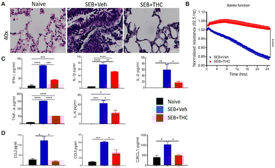 It is well known that dual-dose SEB exposure in C3H mice is fatal due to the massive production of inflammatory cytokines and chemokines that lead to the exponential proliferation of effector T cells and other immune cell phenotypes [18]. Consistent with our earlier published studies, we found that while SEB exposure in mice caused a 100% mortality, treatment with THC led to the 100% survival of the mice [3,19]. Additionally, we found that dual SEB exposure versus naïve mice resulted in a massive infiltration of immune cells in the lungs (Figure 1A). Interestingly, SEB+THC mice showed a noticeable reduction in the abundance of infiltrating cells in the lung parenchyma when compared to SEB+Veh mice (Figure 1A). Electronic cell-substrate impedance sensing (ECIS) was performed to measure the epithelial cell resistance. Our data showed that epithelial cells treated with SEB+THC had a higher resistance than SEB+Veh (Figure 1B). Consequently, SEB+Veh mice, in contrast to naïve mice, had elevated levels of proinflammatory cytokines IFN-γ, IL-1β, IL-2, TNF-α, and IL6 in BALF, while THC treatment led to a significant reduction in these cytokines (Figure 1C). Similar trends for the chemokines, CCL2, CCL5, and CXCL1 were also observed (Figure 1D).