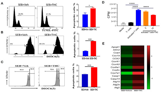 To determine whether the decrease in lung infiltration was due to induction of apoptosis, we performed Tunel staining by flow cytometry. Our data showed that THC induced apoptosis in lung-infiltrating mono-nuclear cells, MNCs (Figure 2A). THC also led to a reduction in the mitochondrial membrane potential by DiOC(6)3 staining (Figure 2B). To confirm our in vivo results, we examined apoptosis in vitro. To this end, we activated naïve splenocytes with SEB (1 μg/mL) for 72 h in the presence of either 10 uM THC or Veh. The cells were then collected and stained with anti-CD3 and DiOC(6)3 and, likewise, THC led to increased apoptosis and the loss of the mitochondrial membrane potential in SEB-activated T cells (Figure 2C). Furthermore, we tested the direct effect of THC on the proliferative capacity of immune cells in vitro by performing a 3H-thymidine incorporation assay, specifically by stimulating naïve splenocytes with SEB and then treating them with THC or Veh for 72 h. As expected, SEB activation led to increased proliferation when compared to non-activated T cells, while 10 μM of THC reduced the SEB-induced proliferation (Figure 2D). We further analyzed lung-infiltrating MNCs using mouse transcriptome arrays, and found that THC increased the expression of genes related to apoptosis, such as caspases (Casp1, Casp14); the release of mitochondrial cytochrome c, including mitochondrial apoptogenic protein 1 or cytochrome c oxidase assembly factor 8 (Apopt1 or Coa8) and Coa4; other mitochondrial cytochrome c oxidases (Cox6a1, Cox7a1, Cox18); apoptosis-inducing factor 2-homologous mitochondrion-associated inducer of death (Aifm2); as well as autophagic cell death comprising autophagy-related 5 and 10 (Atg5 and Atg10) (Figure 2E). These studies suggested THC mediated the induction of apoptosis and autophagic cell death by altering the cytochrome c oxidases of the mitochondrial electron transport chain in MNCs infiltrating the lung in SEB-induced ARDS.