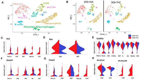 In order to elucidate the precise cells and the genes that may be altered in the lungs, we performed scRNA-seq. Whole lung tissue was collected from SEB-administered mice treated with either THC or Veh and processed to a single cell suspension for scRNA-seq. t-Distributed Stochastic Neighbor Embedding (t-SNE) plots showed that the distribution of the major subpopulations of immune cells in ARDS were alveolar macrophages, Mac1a and Mac1b macrophages, neutrophils, CD4+ and CD8+ T lymphocytes, and natural killer (NK) and NKT cells (Figure 3A). The enrichment of these inflammatory populations was higher in Veh-treated mice than in THC-treated mice (Figure 3B). Interestingly, a scRNA-seq analysis showed an increase in several genes in the SEB+THC versus SEB+Veh groups, which included mitochondria-associated apoptosis regulatory genes. This comprised the elevated expression of Bad in the CD4+ and CD8+ T cells, NKT cells, as well as Mac1a and Mac1b macrophages (Figure 3C); BCL2 Associated X Apoptosis Regulator (Bax) in CD8+ T cells and NKT cells (Figure 3D); Cox4i1c in CD4+ T cells, neutrophils, NK cells, B cells, and alveolar and Mac1b macrophages (Figure 3E); Apopt1 in CD4+ and CD8+ T cells, NKT cells, and NK cells (Figure 3F); as well as Casp3 in CD4+ and CD8+ T cells and Mac1b macrophages (Figure 3G) in the SEB+THC treated group when compared to SEB+Veh mice. Additionally, an scRNA-seq analysis showed that THC increased the expression of genes involved in the metabolic reprogramming of immune cells, specifically genes encoding the mitochondrial solute carrier family of proteins (Slc25) including a phosphate carrier protein, Slc25a3, and an amino acid or iron carrier protein, Slc25a39 (Figure 3H).