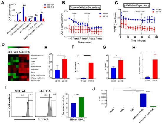 THC treatment decreases T cell activation and alters metabolism to induce apoptosis. Spleen cells were cultured with SEB+THC or SEB+Veh for 72 h, followed by the purification of CD3+ T cells, as described in Methods. (A): OCR in cells during the mitochondrial stress test. (B): OCR in the glucose oxidation dependency test. (C): OCR in the β-oxidation dependency test. (D): Heat map showing dysregulated apoptosis-related metabolites from metabolome analysis of serum (n = 4). (E–H): Concentrations of metabolites in serum from SEB+Veh and SEB+THC mice. (I): DiOC6(3) staining of splenocytes from C3H/HeJ mice activated with SEB (1 μg/mL) in the presence of either vehicle or PLC 200 μM for 72 h. (J): T cell proliferation measured by 3-H thymidine incorporation assay in splenocytes from C3H/HeJ mice activated with SEB (1 µg/mL) in the presence of either vehicle or PLC 200 µm for 72 h. (CPM, counts per minute). Statistical significances are depicted as * p < 0.05, ** p < 0.01, and **** p < 0.0001 between the groups.