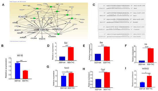 We performed a miR microarray and found a number of dysregulated miRs in these two groups of mice. Ingenuity pathway analysis (IPA) was used to predict the most common pathways involved in modulating the immune cell metabolism and proliferation capacity of lung-infiltrating MNCs. We found that miR-185-3p was downregulated in SEB+THC versus SEB+Veh mice. Per the IPA analysis, miR-185-3p promoted apoptosis induction and inhibited the NFkB signaling (Figure 5A). Next, we validated the downregulation of miR-185 expression in lung-infiltrating MNCs in SEB+THC in the SEB+VEH group using qRT-PCR (Figure 5B). To confirm the alignment existence between the miR-185 and 3′UTR region of target genes, microRNA.org was used (Figure 5C). Furthermore, qRT-PCR validated the upregulation of miR-185 target genes that regulate apoptosis, including Bad (Figure 5D), Bax (Figure 5E), Hrk (Figure 5F), Runx3 (Figure 5G), and Cox4 (Figure 5H). Additionally, we found that NKIRAS2, encoding an inhibitor of NFĸB signaling, was elevated in SEB+THC versus SEB+Veh (Figure 5I).