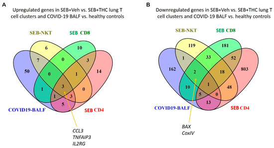 Because patients with a severe form of COVID-19 develop sepsis and ARDS, we next correlated our study with two available gene expression datasets from the BALF of human COVID-19 patients. The datasets were examined for cytokine and apoptotic genes similarly dysregulated between SEB+Veh and SEB+THC using scRNA-seq vs. COVID-19 vs. normal control BALF samples. Venn diagram analysis showed that pro-inflammatory cytokines, including CCL3, IL2RG, and TNFAIP3, were upregulated in CD4+ T cells, CD8+ T cells, and NK cells in the SEB-induced ARDS group and in the BALF of patients with the COVID-19 disease (Figure 6A). Additionally, apoptosis pathway genes such as CoxIV and Bax were down-regulated in the SEB-induced ARDS group and COVID19 patients (Figure 6B).