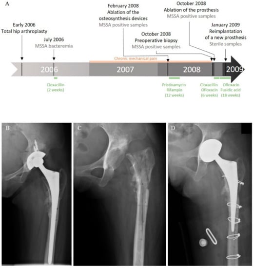 In 2006, a 20-year-old Cambodian woman benefited from a total hip arthroplasty with shortening subtrochanteric osteotomy for a left hip osteoarthrosis secondary to a developmental dysplasia. A hip prosthesis and osteosynthesis devices (plates and screws) were implanted in the femur. Postoperative course was marked by a bacteremia originating from a peripheral catheter-related phlebitis due to a bacterium identified at this time as a methicillin-susceptible Staphylococcus aureus (MSSA). The patient was treated by a two-week course of intravenous cloxacillin (Figure 1A). Six months later, she developed chronic mechanical pain of the left hip. In February 2008, after more than a year of mechanical pain, the ablation of osteosynthesis devices was performed with prosthesis retention (Figure 1A,B).