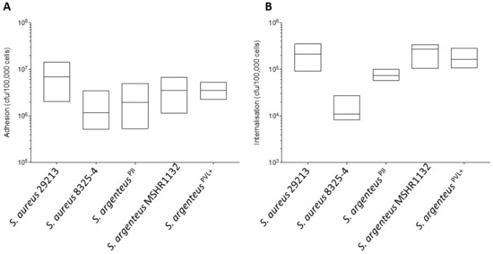 When compared to the other S. argenteus strains, the cellular adhesion was also in the same range (Figure 2A, 2.44 ± 1.84 vs. 3.79 ± 2.21 and 3.65 ± 1.12 × 106 CFU for S. argenteus MSHR1132 and S. argenteusPVL+ respectively).