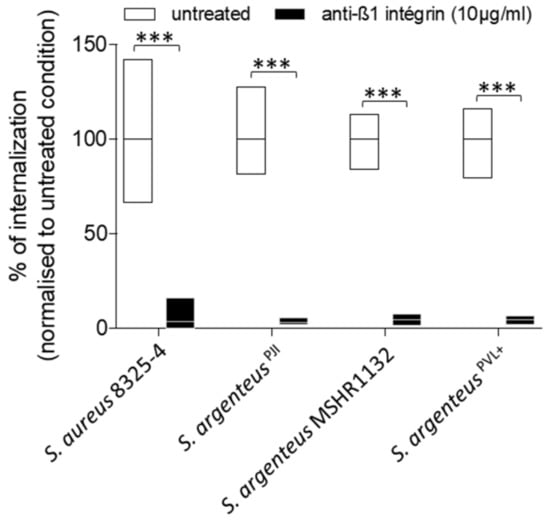 The internalization of S. argenteus strains into MG-63 cells requires β1 integrin. A pre-treatment of MG63 cells with a blocking anti-β1 integrin antibody inhibits more than 90% of S. aureus and S. argenteus strains internalization. Mann–Whitney test was performed for statistical analysis. *** means p < 0.001.