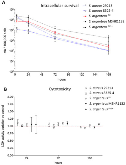 Altogether, these results point out that the S. argenteus isolates can survive intracellularly, as previously observed for S. aureus. However, the intensity of intracellular survival varies between the different S. argenteus strains. In our in vitro model, this could result either from a better intracellular life adaptation or from a decreased cytotoxic power that would limit the release of bacteria in the lethal extracellular environment that contains gentamicin.