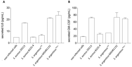Conversely, S. argenteusPJI appeared as a weaker inducer of inflammation with a concentration of secreted IL-6 similar to the poorly invasive S. aureus 8325-4 (Figure 5A, 6.5 vs. 5 vs. 4.8 pg/mL for S. argenteusPJI vs. S. aureus 8325-4 vs. non-infected cells).