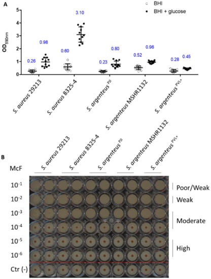 In the presence of glucose, S. argenteus isolates did not respond to a glucose stimulation as much as S. aureus strains, especially when compared to S. aureus 8325-4 (Figure 6A, OD590 = 0.8 vs. 0.98 and 3.1 for S. argenteus vs. S. aureus 29213 and S. aureus 8325-4; OD590 = 0.96 and 0.45 for MSHR1132 and S. argenteusPVL+).