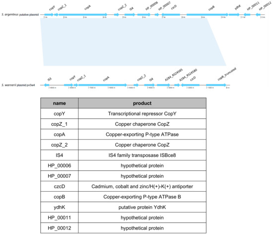 Identification of a putative plasmid in the S. argenteusPJI. A putative plasmid (top) was identified during the genome analysis, similar to the plasmid pvSw4 (bottom, NCBI access number: NC_020266.1) found in S. warneri [28]). The latter covers 73% and shares 99.48% of similarity with the one we identified in S. argenteus PJI. These plasmids encode for proteins mainly involved in copper or heavy metals transport (table).