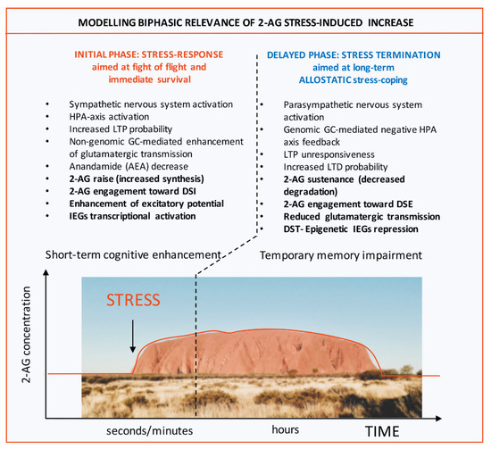 Modelling Biphasic relevance of 2-AG stress-induced increase and its epigenetic allostatic regulation as instrumental to stress response termination: an Ayer(s) perspective. The figure illustrates molecular and behavioral events occurring immediately upon stress perception (INITIAL PHASE) and in second phase in which primary responses, aimed at guaranteeing survival are gradually terminated (DELAYED PHASE). While in the first phase of stress response, which lasts seconds to minutes, cognition is boosted via neuroendocrine enhancement of glutamatergic transmission (short-term cognitive enhancement), in the second phase mechanisms underlying arousal as well as memory consolidation of the traumatic event are allostatically tuned down (resulting in a temporary memory impairment). Within this model, while in the first phase, endocannabinoid 2-AG increases its levels thanks to de novo synthesis by DAGLα, being involved in enhancing excitatory potential via Depolarization-Induced Suppression of Inhibition (DSI), in the second phase its tone is maintained elevated by an epigenetic process aimed at repressing transcription of the two 2-AG hydrolases MAGL and ABHD6. Thus, 2-AG displays a prototypic biphasic behavior. Notably, in this second window of stress response 2-AG is involved in decreasing glutamatergic transmission within the opposite form of endocannabinoid-operated short-term plasticity i.e. the process of Depolarization-Induced Suppression of Excitation (DSE). The graph displays enduring 2-AG stress-induced raise that lasts over both stress-response phases. The picture displays Ayers Rock (Uluru), Australia. Abbreviations used: 2-AG: 2-arachidonylglycerol; DAGLα: diacylglycerol lipase α; MAGL: monoacylglycerol lipase; ABHD6: alpha/beta hydrolase domain containing 6.
