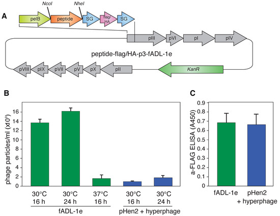 (A) Vector map of the fADL-1e-based plasmid for the bacterial expression of the fd filamentous bacteriophage with the p3 protein N-terminally fused with peptide ligand and 3xFLAG or HA-tags flanked by the SG-linkers. The full vector sequences are available online (Addgene ID: 139441 (3xFLAG) and Addgene ID: 139440 (HA)); (B) Yield of the bacteriophage expression by the fADL-1e- and pHen2-transformed cells after 16 or 24 h of incubation at 30 or 37 °C; (C) Level of the 3xFLAG-p3 in the bacteriophages (109 particles/mL) produced by the fADL-1e- or pHen2-hyperphage-based systems measured by ELISA.