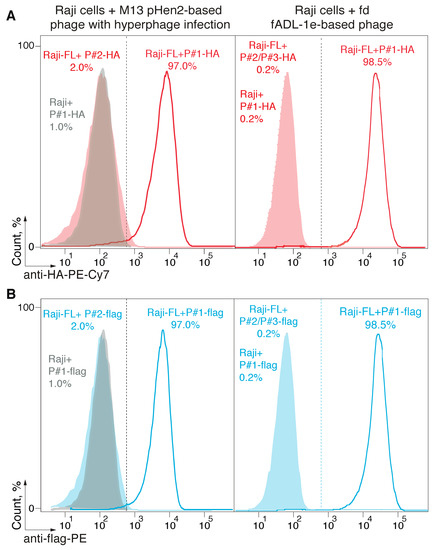 Staining of antigen-specific eukaryotic cells by bacteriophages exposing peptide ligands was performed under protocol described previously [30]. Briefly, 0.5 million Raji and Raji-FL cells were resuspended in 100 μL of PBS with 0.5% bovine serum albumin and 2 mM ethylenediaminetetraacetic acid (EDTA), containing bacteriophages with P#1-P#4 peptides exposed on its surface in the final concentrations from 2 × 1011 to 4 × 1012 particles/mL. Then, the samples were incubated for 1 h at 4 °C with constant shaking and washed three times with PBS containing 2 mM EDTA. Anti-flag-PE or anti-HA-PE/Cy7 fluorescent antibodies (1:500, Biolegend, San Diego, CA, USA) were added to the samples and incubated in the dark for 30 min at 4 °C. Unbound fluorescent antibodies were washed away twice with PBS containing 2 mM EDTA. At each step, cells were centrifuged at 4 °C and 300× g for 5 min and all reagents were pre-cooled to 4 °C. Fluorescence intensity was measured with a flow cytometer (Cell Sorter SH800, Sony Biotechnology, San Jose, CA, USA) at excitation/emission wavelengths 565/578 or 496/785 nm. All data were processed using Flow Jo software (Tree Star, Ashland, OR, USA).