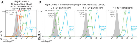 Further, we tested if a fADL-1e- or pHen2-based protocol generates functional phage particles that can be used for the CyCLOPS technique. The ligand–receptor interaction was studied following the previously developed methodology [30]. Raji cells that express membrane-tethered BCR in a single-chain format (Raji-FL) were stained with its BCR peptide ligand (P#1) exposed on the surface of filamentous bacteriophages produced via phage fADL-based or phagemid pHen2-based vectors. The phage particles were used in a concentration range of 2 × 1011–5 × 1012 bacteriophages per mL. The binding of bacteriophages to the eukaryotic cells was detected by incubation with the anti-HA-PE-Cy7 (Figure 2A) or anti-flag-PE (Figure 2B) fluorescent antibodies, which was followed by flow cytometry. Similar to the results obtained previously [30], usage of the hyperphage and pHen2-based vector allowed detecting 97.0% of antigen-specific cells with a 2% false-positive signal level, which corresponded to a control experiment with Raji-FL cells stained with bacteriophages that carried an irrelevant peptide P#2. The application of the fADL-1e-produced bacteriophages with either HA- or 3xFLAG-tag at a range of concentrations from 2 × 1011 to 5 × 1012 phage particles per mL allowed us to confidently select 98.5 ± 0.4% of Raji-FL cells with a 0.2% false-positive signal level. These data confirm the possibility of the fADL-1e-based vectors to produce bacteriophages, which are highly suitable for the antigen-specific selection of the eukaryotic cells by flow cytometry. It may be suggested that the fADL-1e-based phage vector is more beneficial as compared to pHen2 phagemid not only in terms of its productivity, but also an increased separation efficiency.