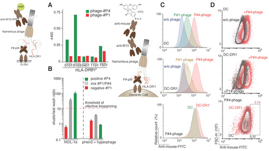 Selection of the HLA class II ligands. (A) Binding of peptide ligands exposed on the phage particles by various recombinant HLA-DRB1 molecules (0101, HLA-DRB1*0101; 0103, HLA-DRB1*0103; 0401, HLA-DRB1*0401; 1101, HLA-DRB1*1101; 1501, HLA-DRB1*1501) measured by ELISA; (B) The HLA class II peptide epitope selection by fADL-1e-based (left) and pHen2-based (right) phage display. Ligand–receptor interaction was studied by incubating the recombinant HLA-DR1 (in complex with HLA-DM) with its peptide ligand (P#4) itself or in mixture with irrelevant peptide P#1 (P#4/P#1 ratio 1:100) exposed on the surface of the filamentous bacteriophage. Phages exposing only irrelevant P#1 peptide were used as a negative control. Afterwards, the phage-HLA complexes were captured by anti-MHC II antibodies. After extensive washing steps, the E. coli TG1 cells were infected with the eluted phages. The CFU of the last wash and eluate were estimated for each selection experiment. Ratio of the CFU of eluate versus last wash (n = 3) are plotted on the logarithmic y-axis. A ratio greater than one order of magnitude indicates effective selection; (C,D) Cell-based detection of the HLA II–ligand interaction with the fADL-1e based bacteriophages by flow cytometry. Non-transduced dendritic cells (DC) and dendritic cells transduced with HLA-DRB1*01:01 (DC-DR1) were incubated with filamentous fADL-1e-based bacteriophages exposing P#1 or P#4 peptides at a concentration of 7 × 1012 phage particles per mL. Fluorescence signals are plotted on the x-axis, and either the percentage of the recorded events (histograms) (C) or FSC-H (contour plots) (D) is on the y-axis.